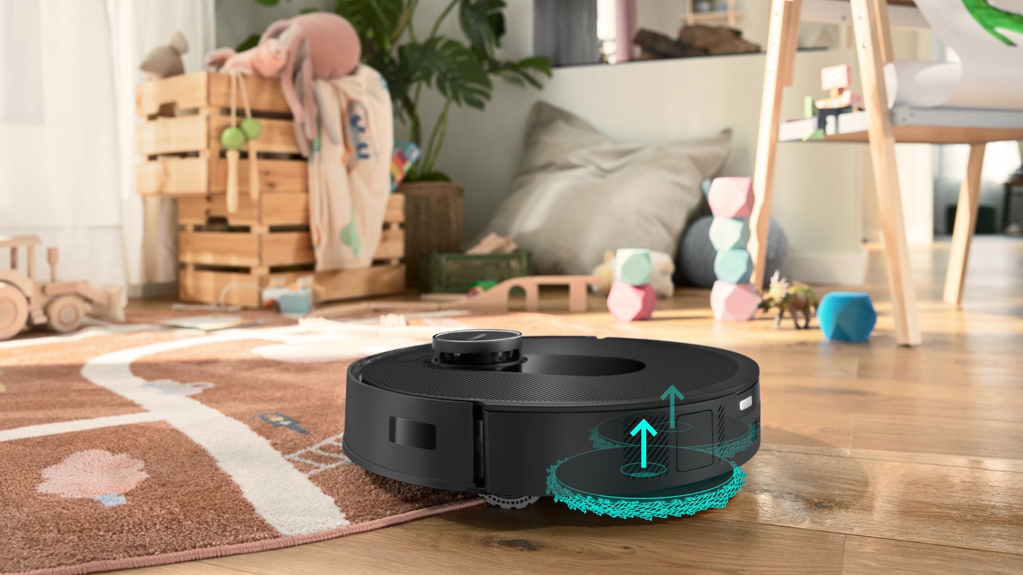 | Droog-nat servicestation: opladen, automatische lediging van de stofcontainer van de robot in een geïntegreerde stofzak van 3 L, dweilpads wassen met water verwarmd tot 70°C, dweilpads drogen met warme lucht en automatische detectie van extreem vieze dweilen. |