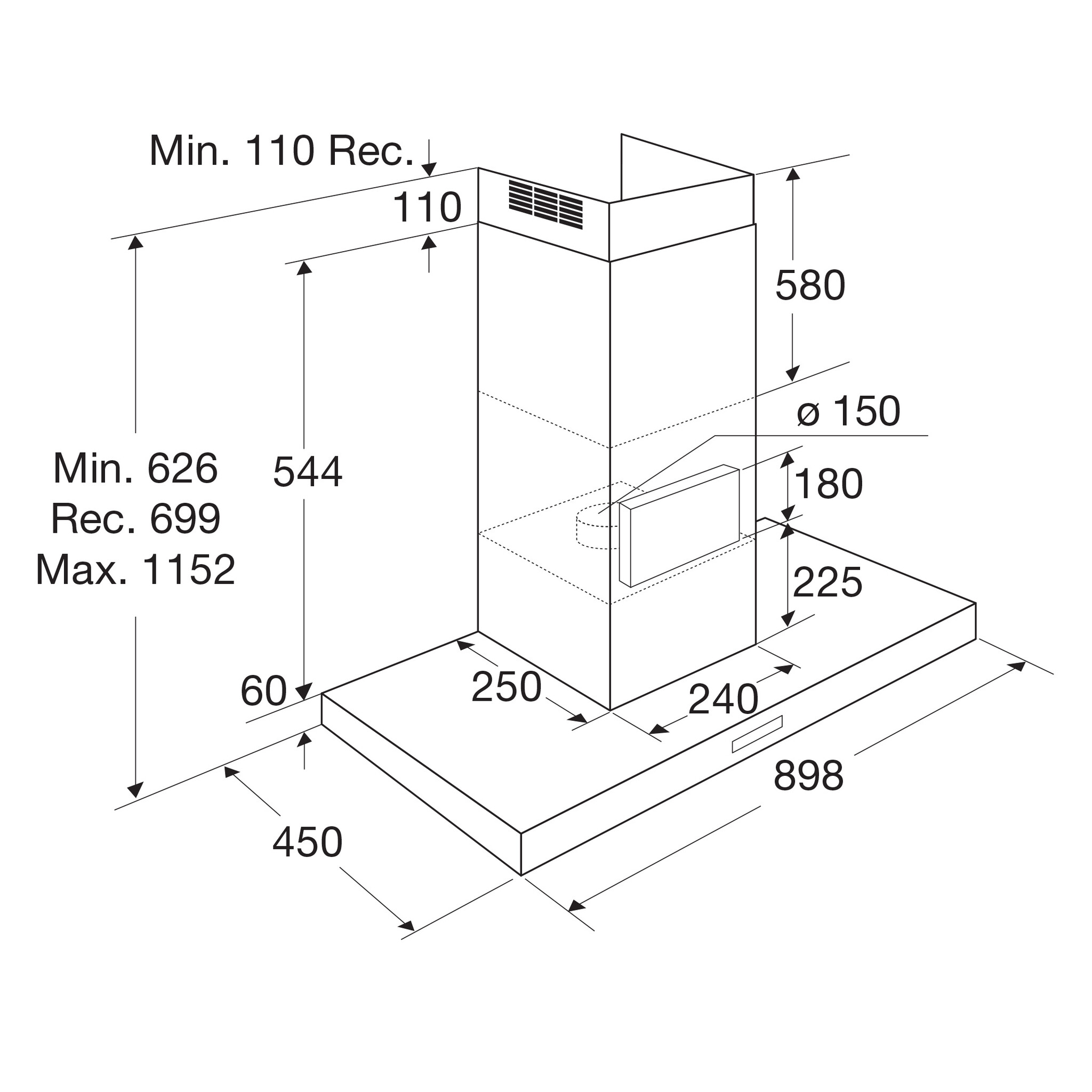 Luchtafvoer afzuigcapaciteit (min/max/int): 260/ 495 / 600 m3/u