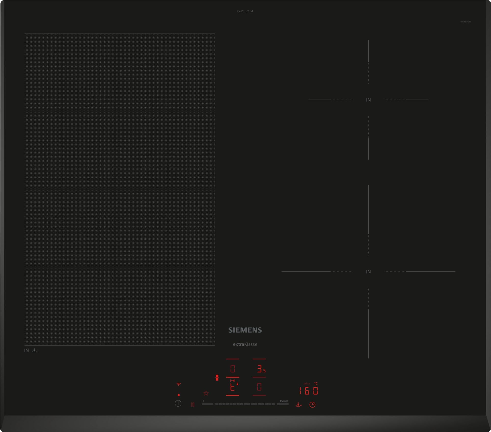 Automatic join split: Bij het plaatsen van groot kookgerei verbindt de kookplaat automatisch twee kookzones tot een grote zone. |