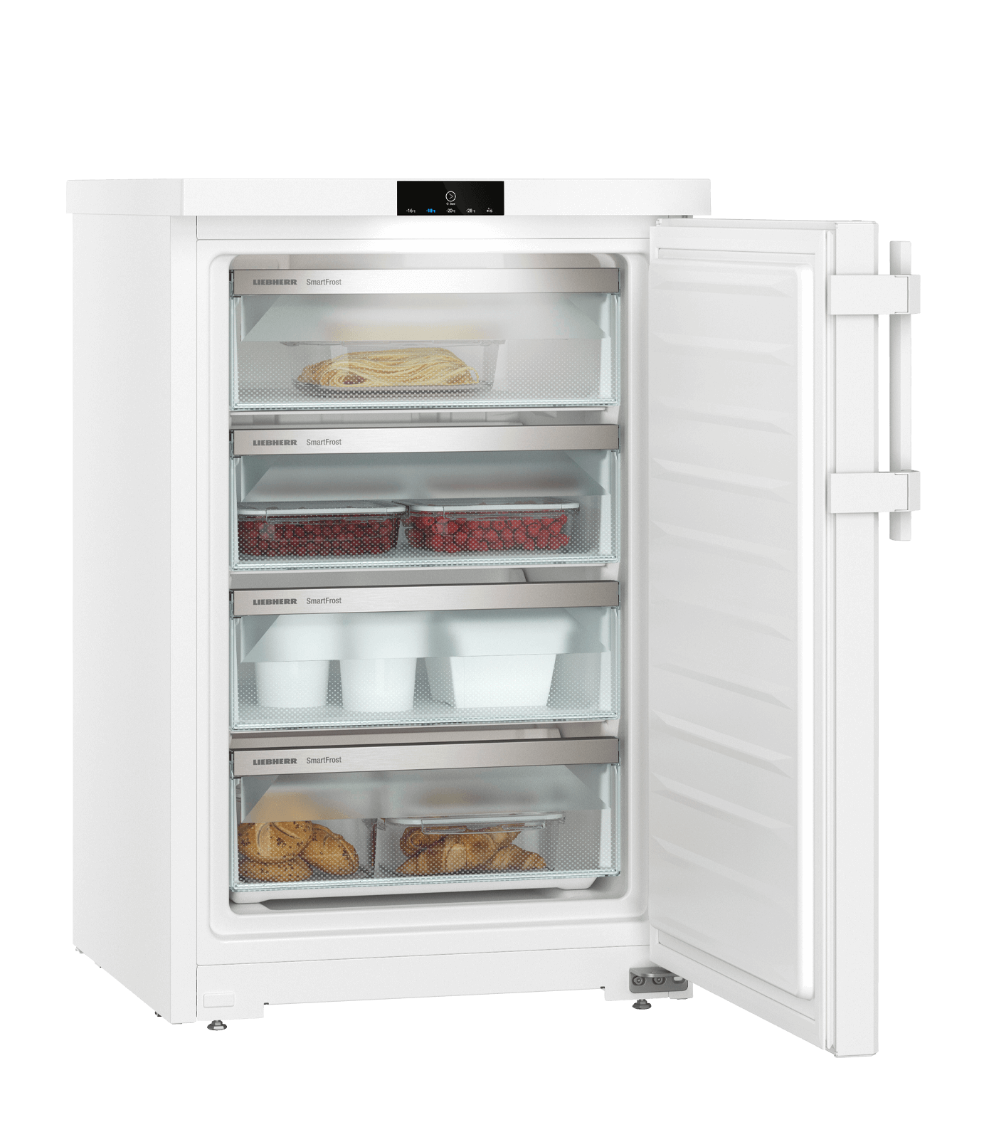Deze compacte SmartFrost diepvrieskast van 55 cm breed kan snel worden ontdooid en gereinigd. Ook het temperatuurdisplay met tiptoetsbediening, LED-verlichting en adaptieve invriesautomaat zorgen voor extra bedieningsgemak. Nog meer gemak: invriezen én bewaren kan in alle lades. Een akoestisch deur- en temperatuuralarm helpt de producten zo veilig mogelijk te bewaren. En mocht door een stroomstoring de temperatuur oplopen, dan toont het display de hoogst bereikte temperatuur en is kwaliteitscontrole van de producten snel uitgevoerd. Geschikt om in een onverwarmde schuur te plaatsen.