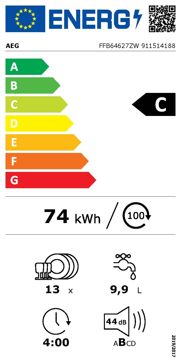 Energieverbruik voor 100 wascycli ecoprogramma (kWh) (EU 2017/1369): 74