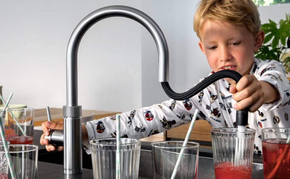 De Flex is de enige Quooker-kraan met een handige, flexibele uittrekslang. Naast warm, koud en 100°C kokend water kan de Flex ook gekoeld en bruisend water geven, als je hem combineert met de Quooker CUBE. Dankzij de kokendwaterstop kan de Flex geen kokend water geven als de slang uitgetrokken is.