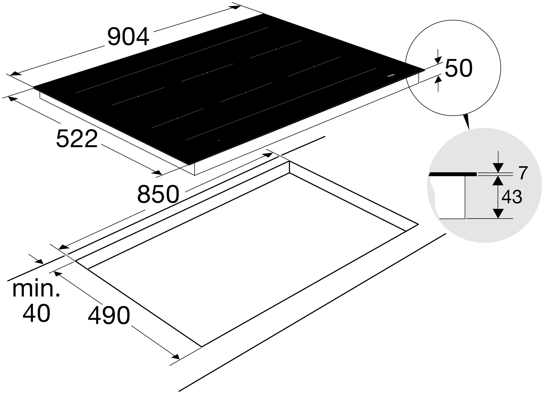 Kookplaat past in een nismaat van 850x490 mm
