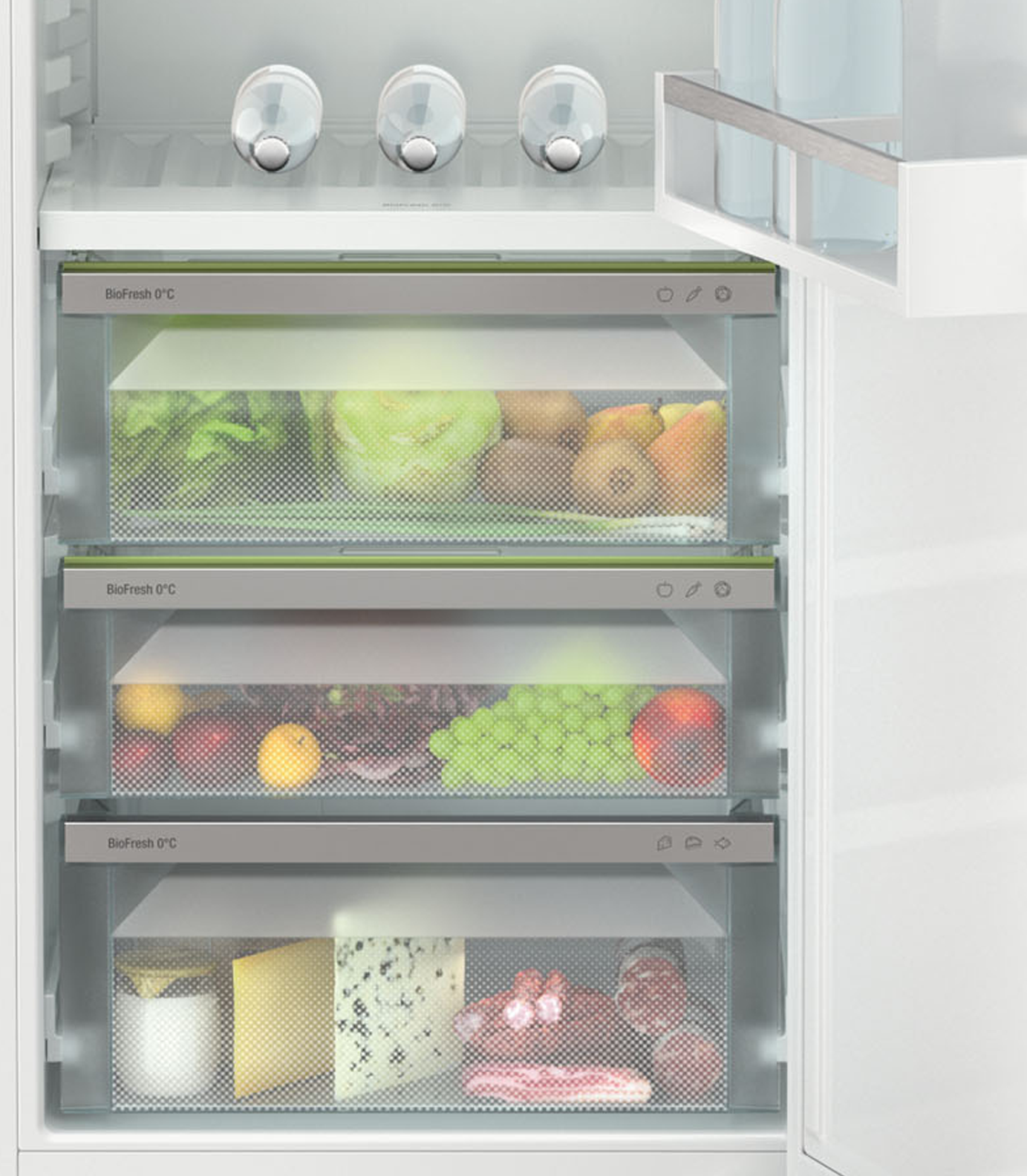 Deze inbouwkoelkast biedt net dat beetje extra. De deur met SoftSystem sluit altijd zacht en volledig. Het deelbare draagplateau en het geïntegreerde flessenplateau bieden extra flexibiliteit. In de 3 BioFresh laden op telescooprails bewaart u groenten en fruit tot 3x langer dan in een normale groentelade. De temperatuur is via het Monochroom display met Touch-bediening instelbaar en toont naast de actuele temperatuur ook alarmmeldingen bij bijv. een stroomstoring. Voorbereid voor smarthome toepassingen.