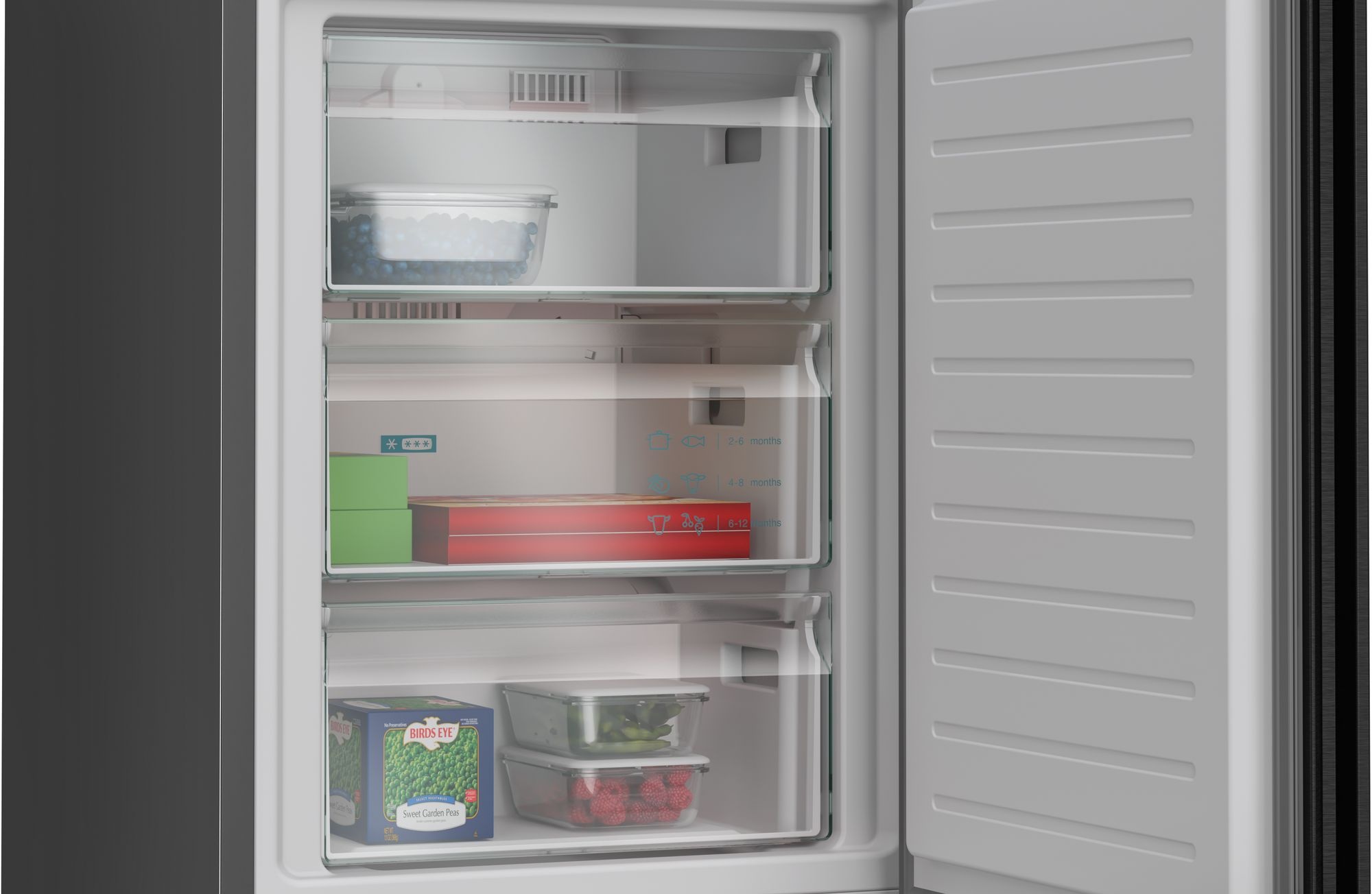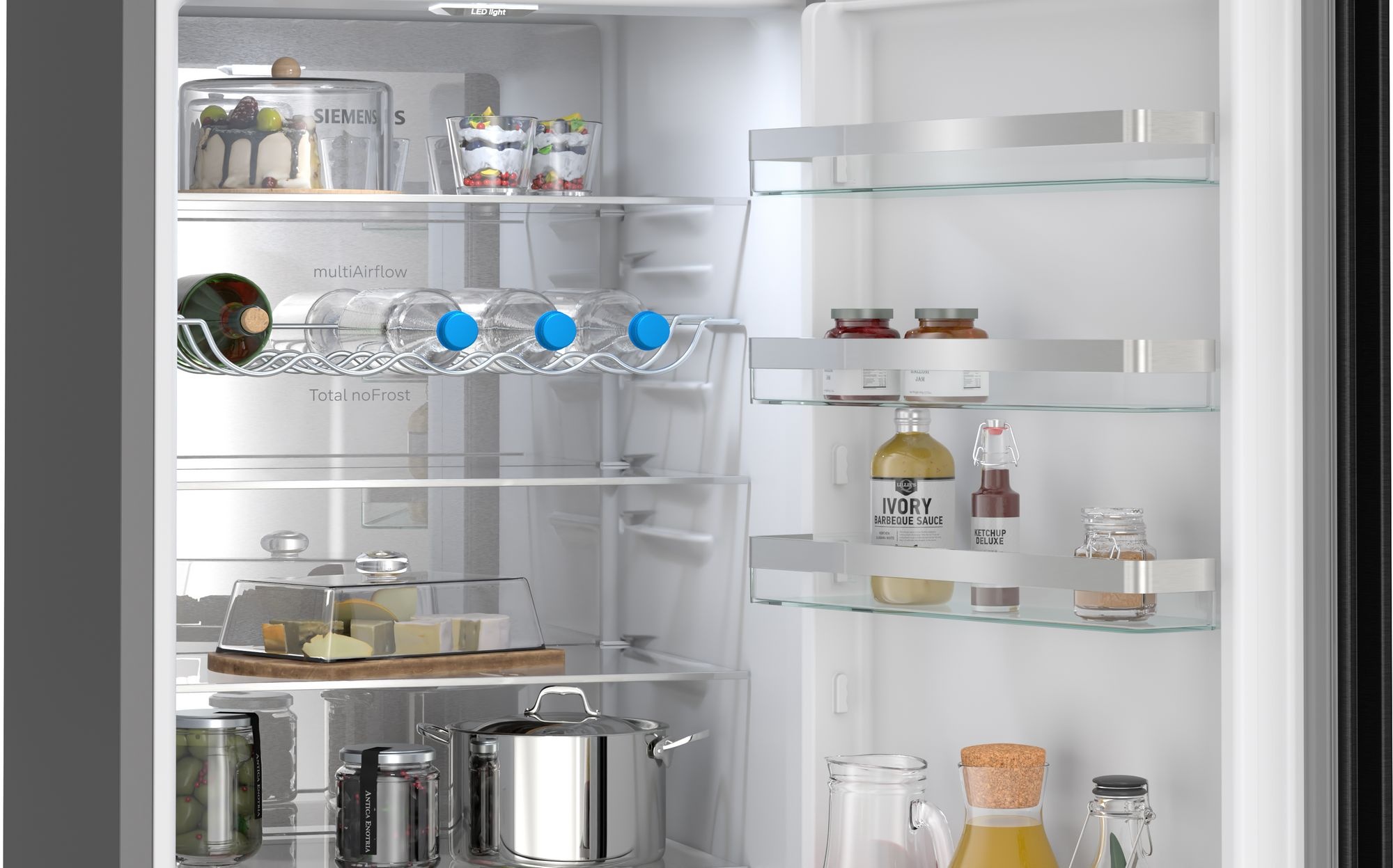 De vrijstaande koel-vriescombinatie met hyperFresh <0°C> voor langere versheid, Total noFrost zodat u nooit meer hoeft te ontdooien, en een metalen achterwand voor een gelijkmatige koeling.