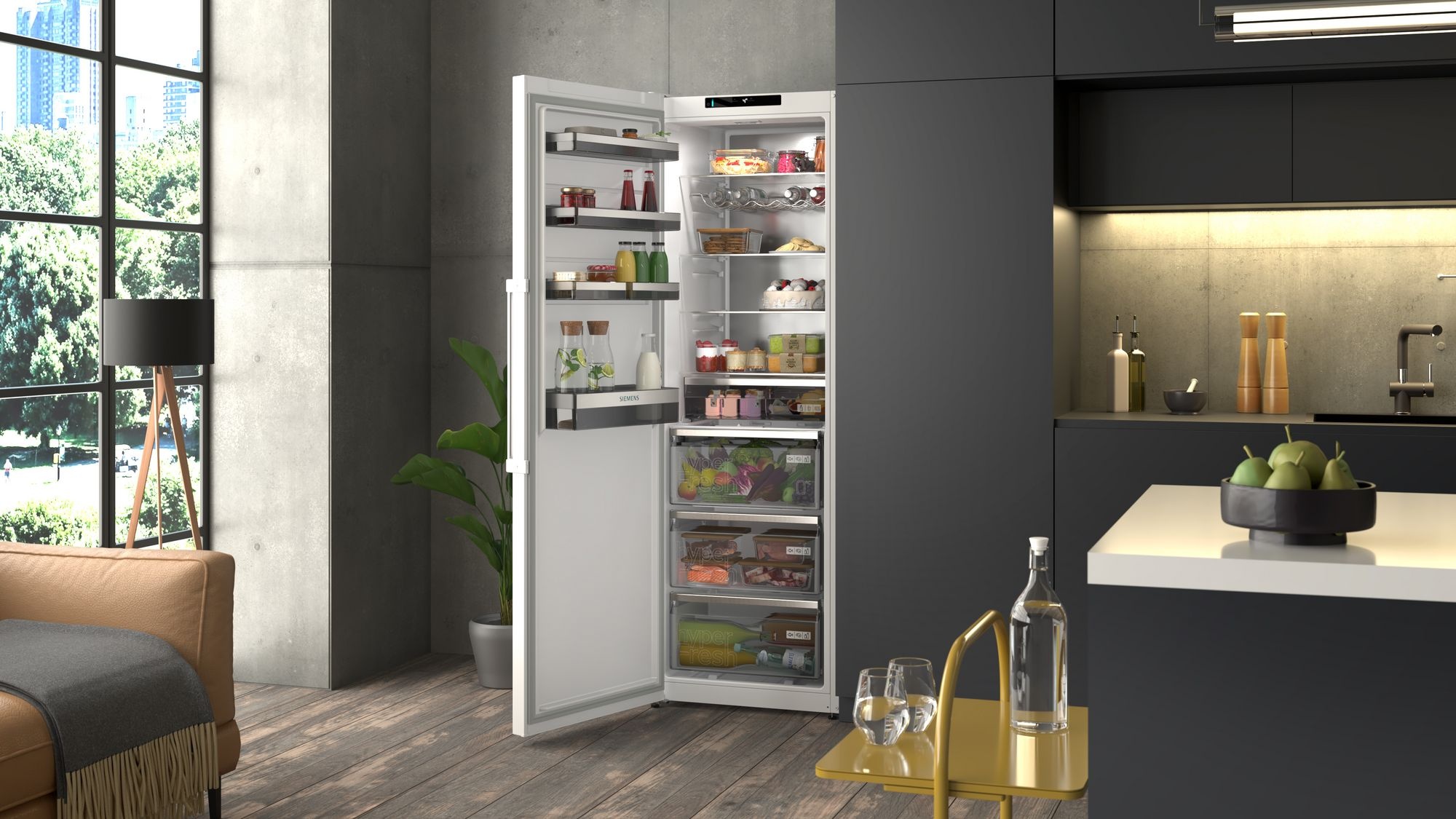 Vrijstaande koelkast met hyperFresh 0°C voor langere versheid, een verrassend grote capaciteit om moeiteloos boodschappen te bewaren en een handgreep om de deur gemakkelijk te openen.