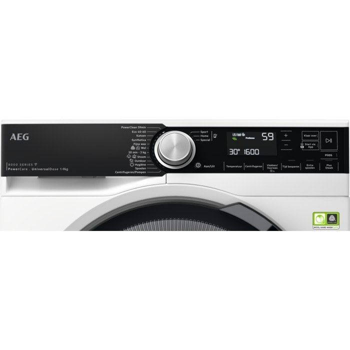- Wasprogramma's: Powerclean 59Min, Eco 40-60, Katoen, Synthetica, Delicates, Wol, 20Min 3Kg, Steam, Outdoor, Hygiene, Spoelen, Centrifugeren/Pompen