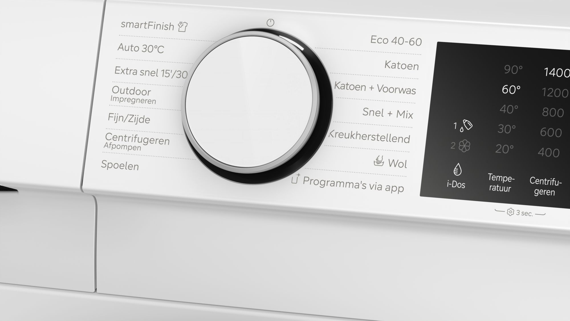 | Programma's te selecteren via de app: Trommelreiniging, Overhemden, Hygiene, Jeans/Donkere was, Microplastic, Sport/fitness |